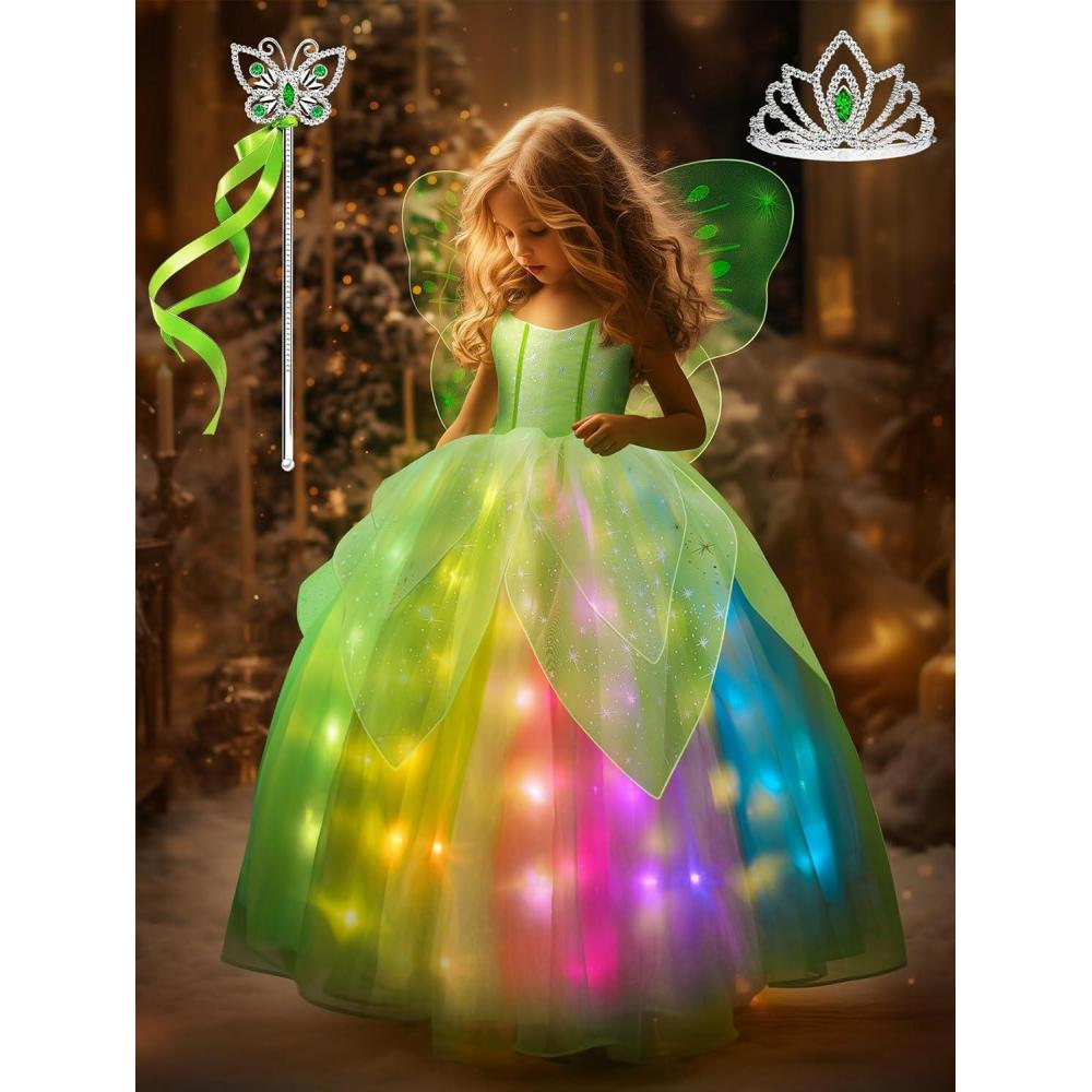 Light Up Girls Halloween Costume Toddler Fairy Dress & Wings Green Fairy Girls Costume Princess Ball Gown Kids(Rgb+green)